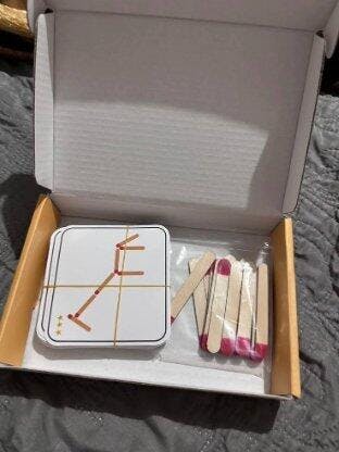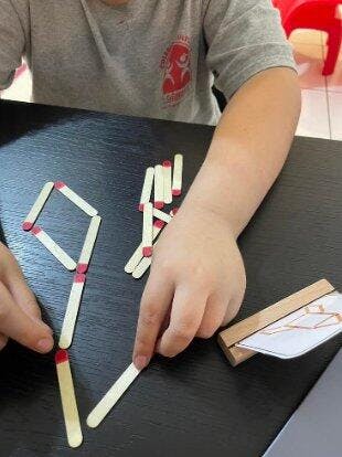 Un juego Montessori para mentes inquietas: los niños deben usar palitos de madera tipo fósforos para recrear figuras geométricas, resolver desafíos lógicos y aprender jugando.