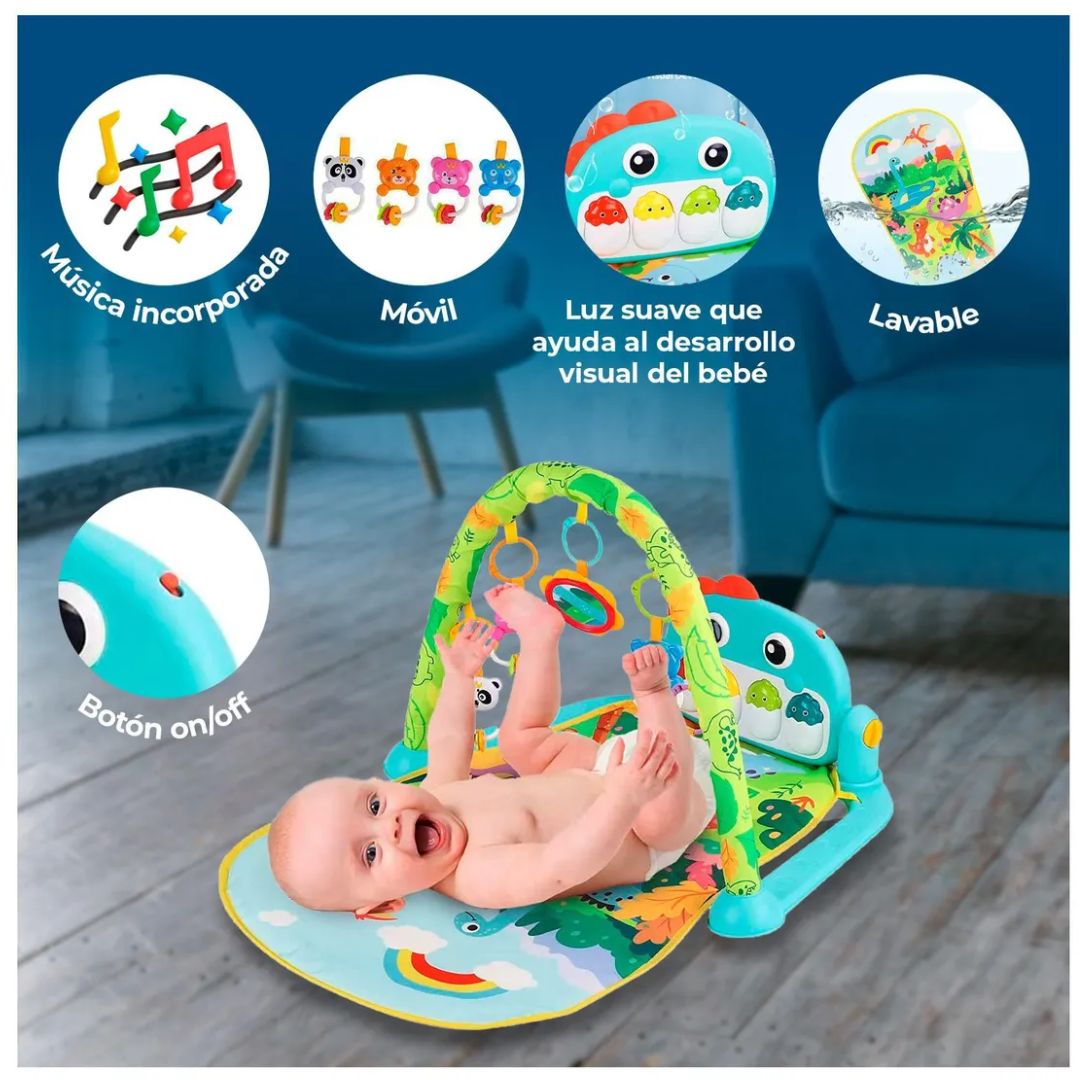 Incluye un teclado musical con luces que se activa con los pies, juguetes colgantes desmontables, espejo de autodescubrimiento y una alfombra suave, colorida y lavable.