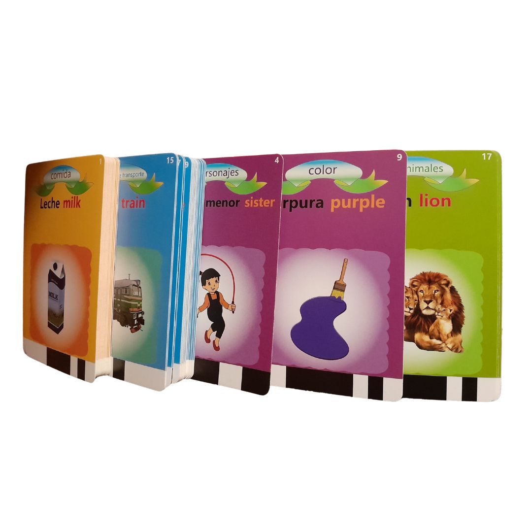 Ideal para niños y niñas desde los 3 años que están iniciando el reconocimiento de palabras y sonidos en inglés y español.